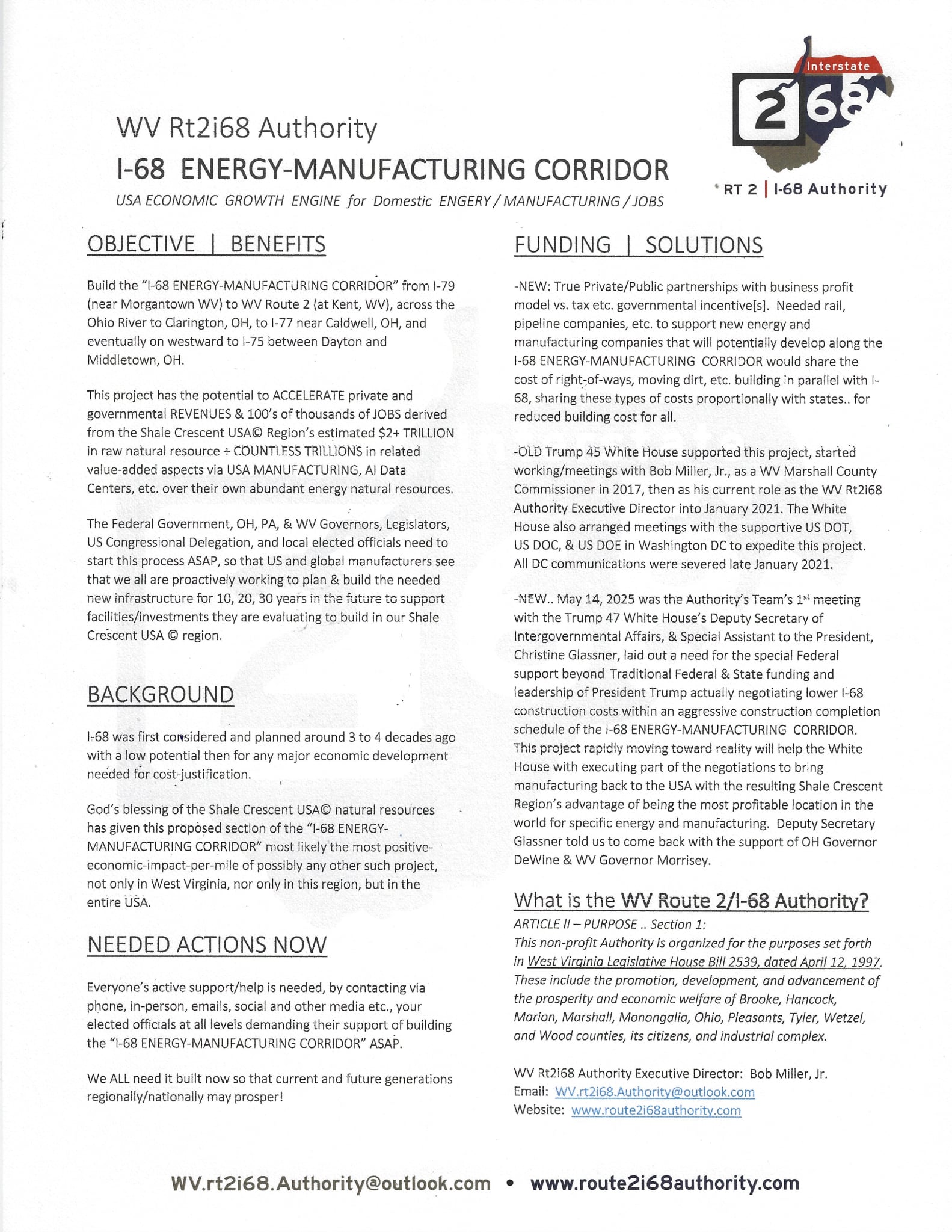 Advocate extending the I-68 ENERGY CORRIDOR from I-79 near Morgantown, WV in North Central West Virginia, westward to WV Route 2 along the Ohio River Valley.